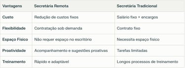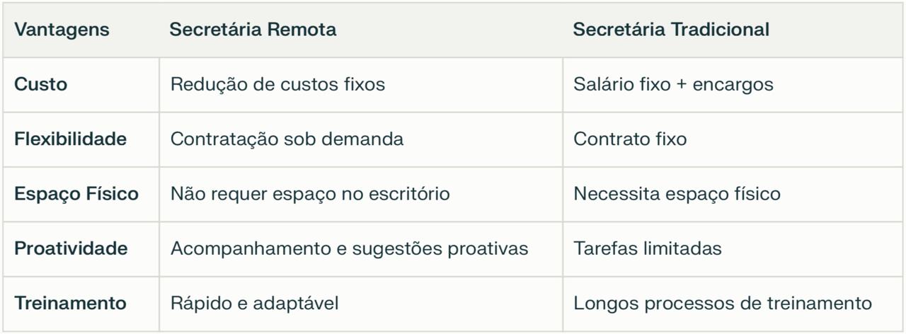 Com uma secretária remota, você elimina custos com vínculos empregatícios, encargos trabalhistas e benefícios como férias e décimo terceiro. O custo fixo mensal é previsível e sem surpresas.